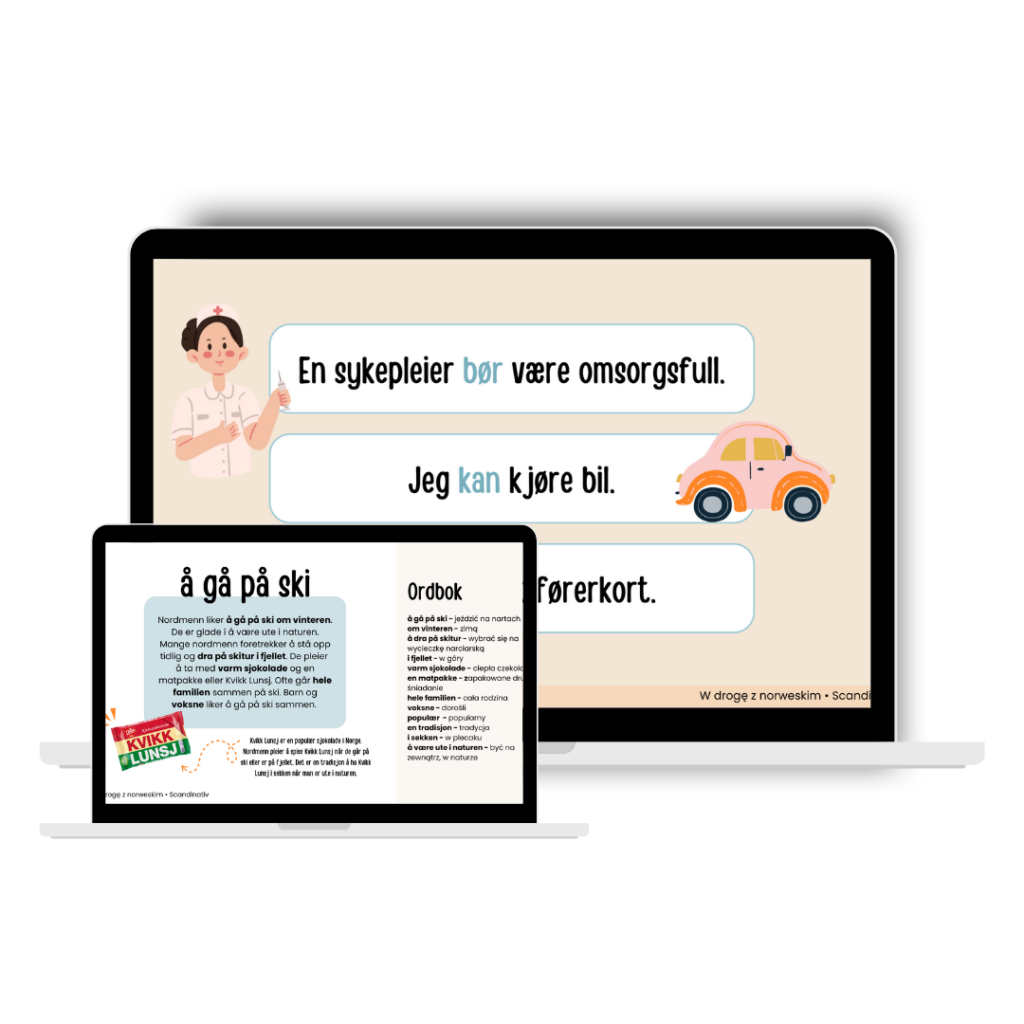 Jeśli ta lekcja Ci się spodobała, to mam dla Ciebie świetną wiadomość – kurs „W drogę z norweskim” pomoże Ci osiągnąć swobodę w norweskim! To aż 12 tygodni pełnych norweskiego z życia. Krok po kroku przeprowadzę Cię przez wszystkie etapy, od podstaw do mocnego A1.